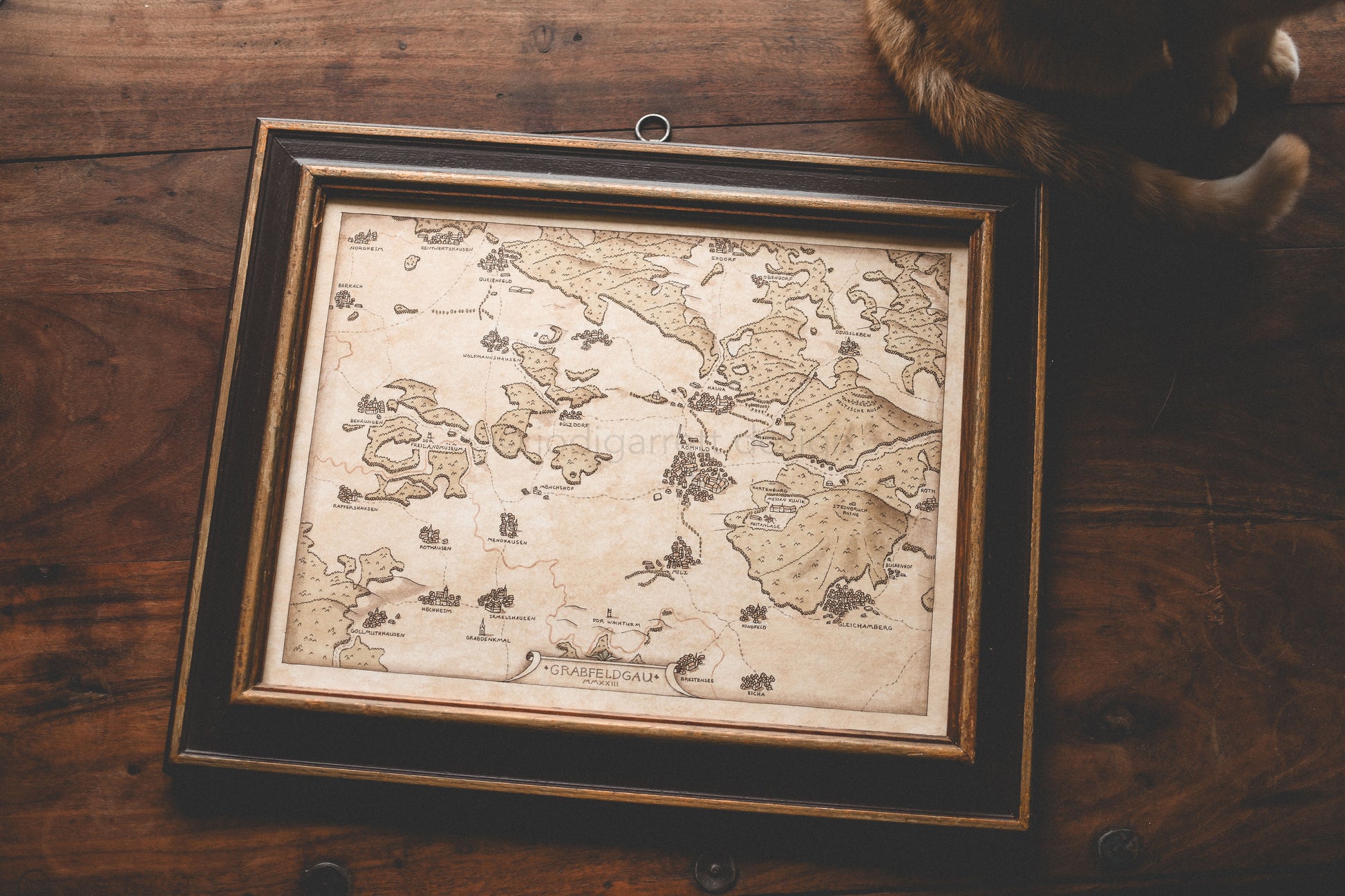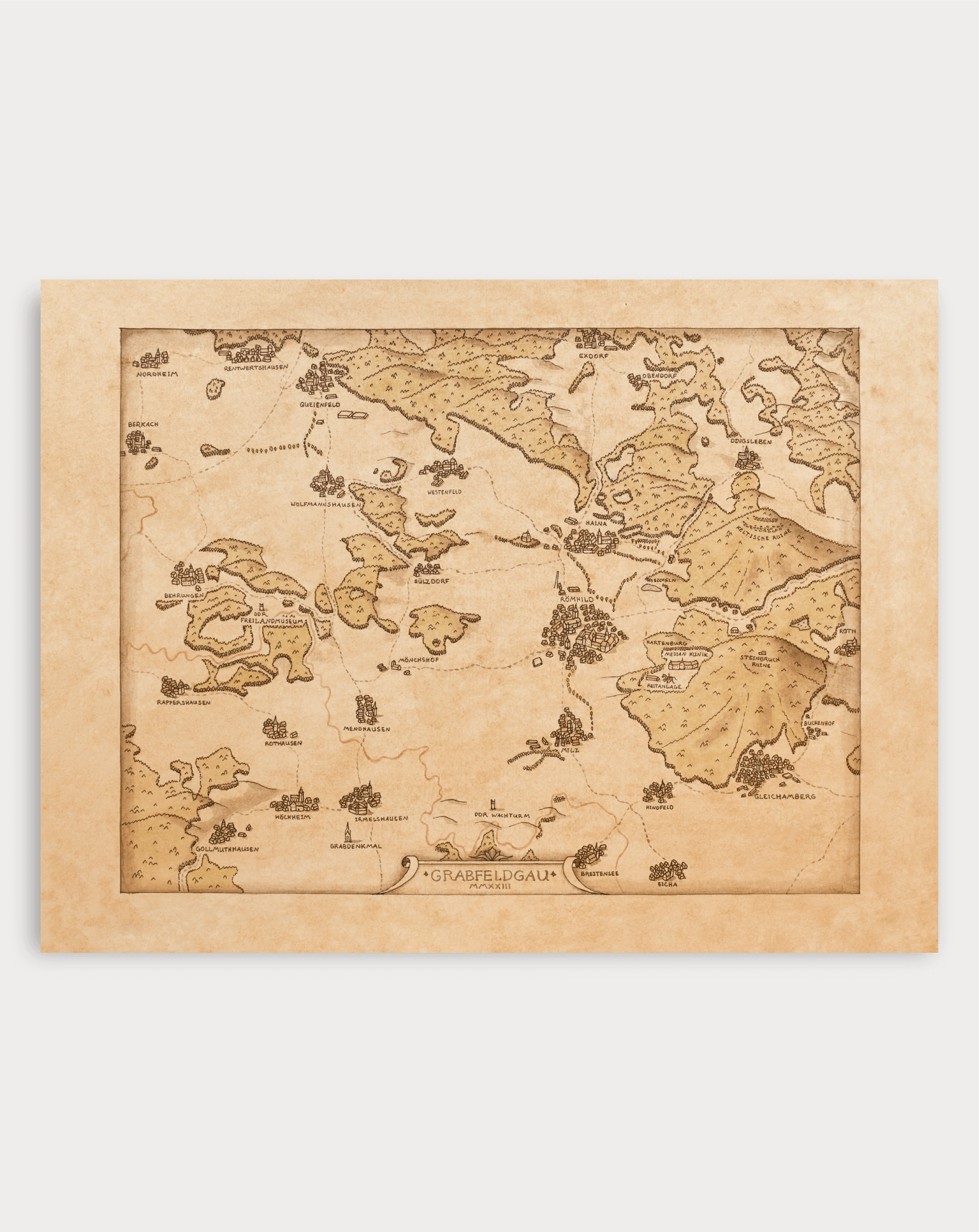 Dieses aufwendig gestaltete Poster zeigt eine fantasievolle Landkarte des historischen Grabfeldgau, der Region rund um Römhild und Grabfeld in Thüringen. Inspiriert von den Karten in klassischen Fantasy-Büchern, wurde jede Ortschaft, Landschaft und historische Besonderheit in feinem Tintenstil gezeichnet – ganz ohne Drachen, aber voller Geschichte.