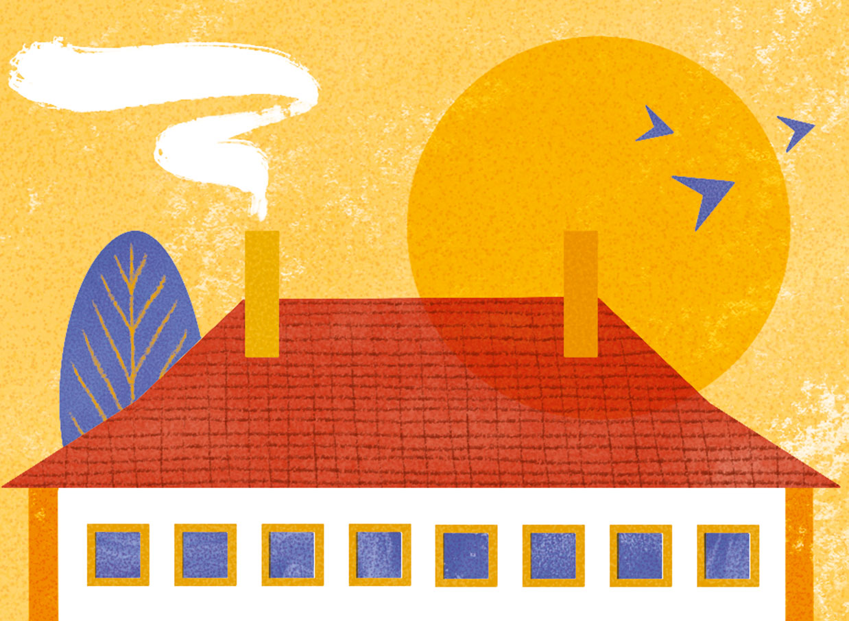 Die Illustration kombiniert klare Linien mit texturierten Flächen in Gelb, Rot und Violett, wodurch ein moderner, zugleich warmherziger Stil entsteht. Am unteren Rand des Bildes steht der humorvolle und nachdenkliche Spruch:
